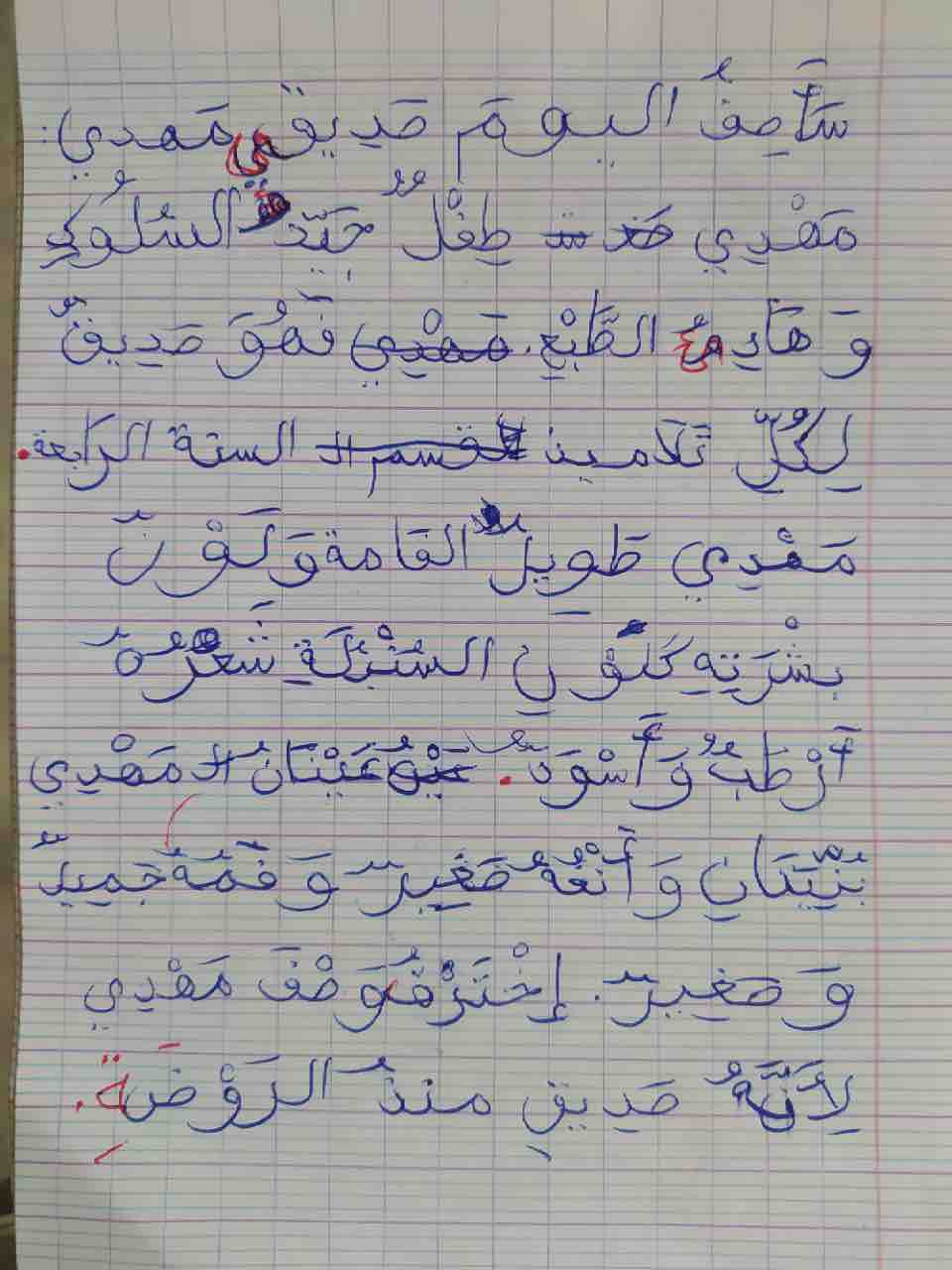مهدي طفل جيد السلوك وهادئ الطبع. فهو صديق لكل تلاميذ السنة الرابعة. مهدي طويل القامة ولون بشرته كلون السنبلة، شعره أرطب وأسود. عينان مهدي بنيتان وأنفه صغير.